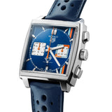 The iconic TAG Heuer Monaco X Gulf Special Edition 39mm Automatic Chronograph Watch CBL2115.FC6494 boasts the charismatic livery of the Gulf brand. Its blue sunray brush dial features the signature thin Gulf stripes and logo at 6 o’clock, as well as a vintage TAG Heuer logo at 12. True to its maverick history, this watch is a legendary addition to any collection.