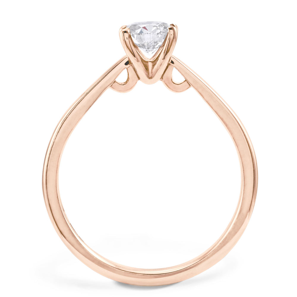 This stunning solitaire diamond engagement ring is beautifully hand-crafted in 18ct rose gold. Sitting proudly, the dazzling certificated 0.33ct round brilliant cut diamond, D in colour, SI2 clarity, is cradled tenderly by a classic four claw setting, with intricate detail beneath the diamond and emphasising the sparkling stone.