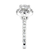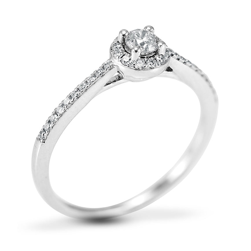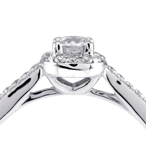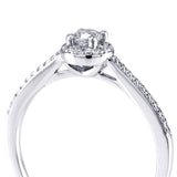 Our graceful and dazzling buttercup engagement ring sparkles and shines brilliantly from every angle, emitting a beacon of incandescent light from both the ring's impressive diamond centre and its elegant shoulders. The charmingly angelic buttercup flower is delicate with shiny, silky petals and they dazzle and dance in the breeze throughout spring and summer; blissfully like a happy marriage. Comparatively, the stunning ring radiates luminosity with its 0.10ct round brilliant diamond, as well as the diamond set shoulders. The ring is set with an effective halo setting where the placement of diamonds are set in a concentric circle around the centre diamond which creates the illusion that the centre stone is larger, intensifying the overall sparkle. The total carat weight of the shoulders and halo is 0.15ct. The glossy white platinum band is slim and knife-edged, increasing the ring's elegance which looks just harmonious and timeless on the hand.