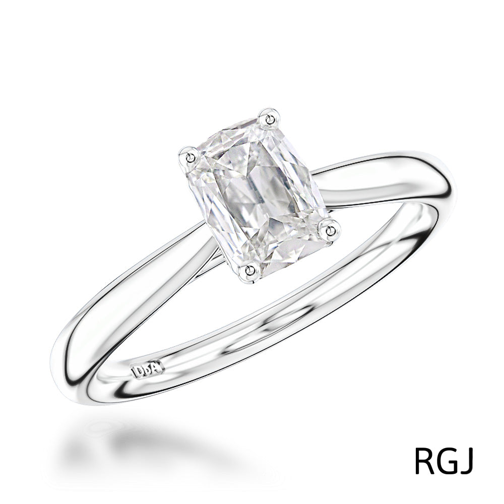 This stunning ring is set with a dazzling certificated 0.90ct elongated cushion cut diamond, E in colour, VS2 clarity, proudly sitting in a four claw setting.