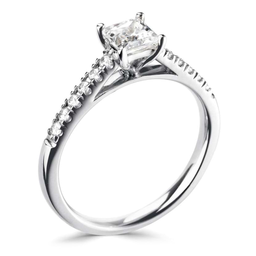 This stunning platinum engagement ring is hand-made here in the UK by our extremely skilled jewellers. Adorned with a dazzling certificated 0.50ct princess cut diamond, F in colour, SI1 clarity, which is cradled elegantly in a four claw setting. To add further sparkle, the shoulders of this beautiful ring are set with 0.18ct of round brilliant cut diamonds.