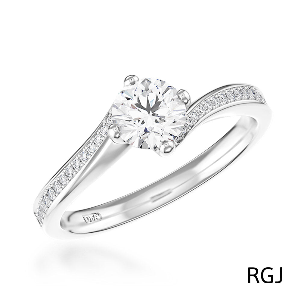 This ring is adorned with a central 0.22ct dazzling certificated round brilliant cut diamond, D in colour, VS1 clarity, cradled in a four claw compass setting. To add extra sparkle the delicate twisted shoulders are set with a further 0.10ct of round brilliant cut diamonds.