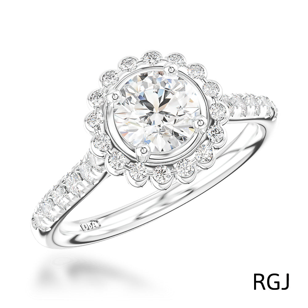 Taking on a fresh look with the beautiful scalloped detailing, this stunning round brilliant cut diamond engagement ring is perfectly hand-crafted in luxurious platinum.