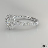 This gorgeous ring is set with a central dazzling certificated 0.40ct round brilliant cut diamond, F in colour, VS2 clarity, in a classic four claw setting. To add extra sparkle the central diamond is surrounded by a diamond halo and diamond set shoulders with a total carat weight of 0.30ct.