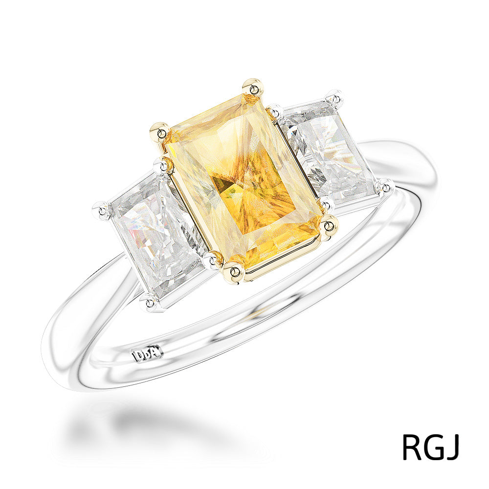 Hand-crafted in luxurious platinum, this ring is adorned with three certificated radiant cut diamonds, a central 2.01ct yellow diamond, VVS2 clarity, secured in an 18ct yellow gold claw setting, which sits beautifully between the two dazzling 0.50ct radiant cut diamonds, both G in colour, VS2 clarity.