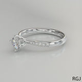 This ring is adorned with a central 0.40ct dazzling certificated round brilliant cut diamond, E in colour, VS2 clarity, cradled in a four claw compass setting. To add extra sparkle the delicate twisted shoulders are set with a further 0.08ct of round brilliant cut diamonds.