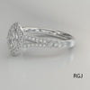 This ring is adorned with a central certificated 0.45ct dazzling marquise cut diamond, G in colour, VS2 clarity, in a four claw setting. To add extra sparkle the stunning stone is surrounded by a diamond halo and diamond set split shoulders with a further 0.31ct of round brilliant cut diamonds.