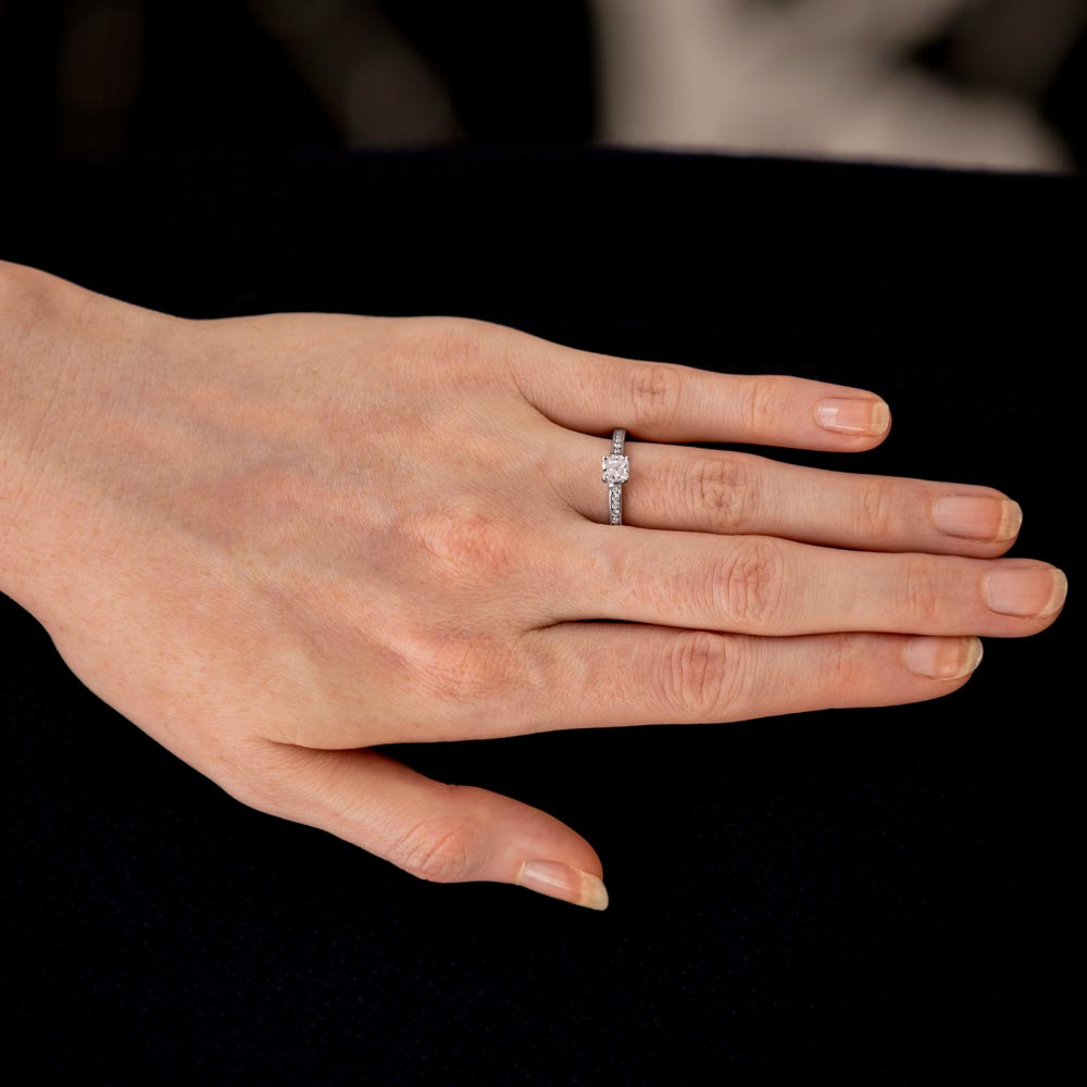 Effortlessly elegant, this striking platinum diamond ring is the perfect expression of love and romance. The lustrous, pure white, polished platinum band perfectly accentuates the certificated 0.55ct cushion cut diamond in a contemporary four-claw setting which is further enhanced by sparkling 0.21ct diamond set shoulders set into a channel setting. This ring is glamorous and contemporary as well as hinting a graceful, vintage heritage. A ring so beautiful, certain to make any woman smile.