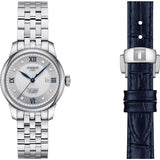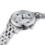 Le Locle, nestled in the Swiss mountains since the late 17th century, has been a pivotal location for watchmakers, including Tissot since 1853. In 2003, the renowned brand introduced the “Le Locle” collection to honour its birthplace, featuring an innovative design inspired by its iconic clock tower. The Le Locle 20th Edition seamlessly blends modernity with tradition, boasting a 29mm silver dial with blue Roman indices, Clous de Paris detailing and 8 dazzling diamonds. Leaf hands complete the classic yet contemporary look.