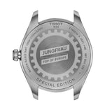Immerse yourself in the rich Swiss heritage and longstanding partnership between Tissot and Jungfrau, manifested in exquisite timepieces that pay homage to the untamed Alps and unparalleled Swiss craftsmanship. As you stand at the meeting point of earth and sky, where the air becomes thin and the horizon stretches far and wide, experience a different flow of time - one effortlessly captured in the PR 100 Jungfrau Special Edition. This watch, powered by a reliable quartz movement, features a delicately engraved dial showcasing the majestic Jungfrau mountains and an inscription on the case back: 'Jungfrau - Top of Europe,' emphasizing their connection to this revered Swiss landmark. Discover this exclusive 34mm timepiece with its elegant silver dial and elegant blue indexes and hands.