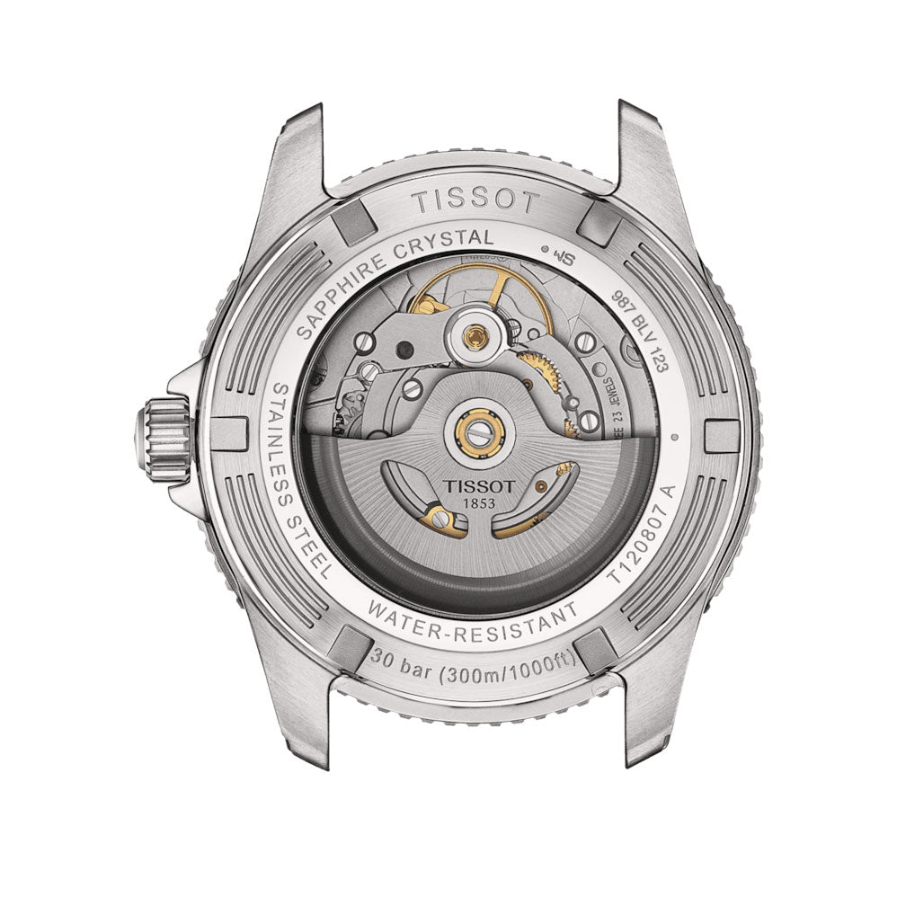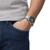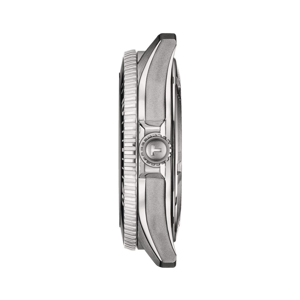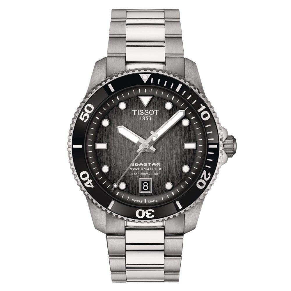 Experience the upgraded version of one of Tissot's prominent collections with the new Seastar 40mm Powermatic 80. This latest release has undergone a subtle transformation, featuring a notch along the case edges for a more compact and refined look. With a water resistance of up to 1000 feet (300 meters), this automatic watch is perfect for those seeking a sporty yet commanding timepiece. Additionally, Super-LumiNova® coated hands and hour markers provide enhanced visibility in low light conditions. Explore the distinctive design of this stainless steel model with a black gradient dial and matching bezel, embodying the collection's signature blend of sportiness and boldness.