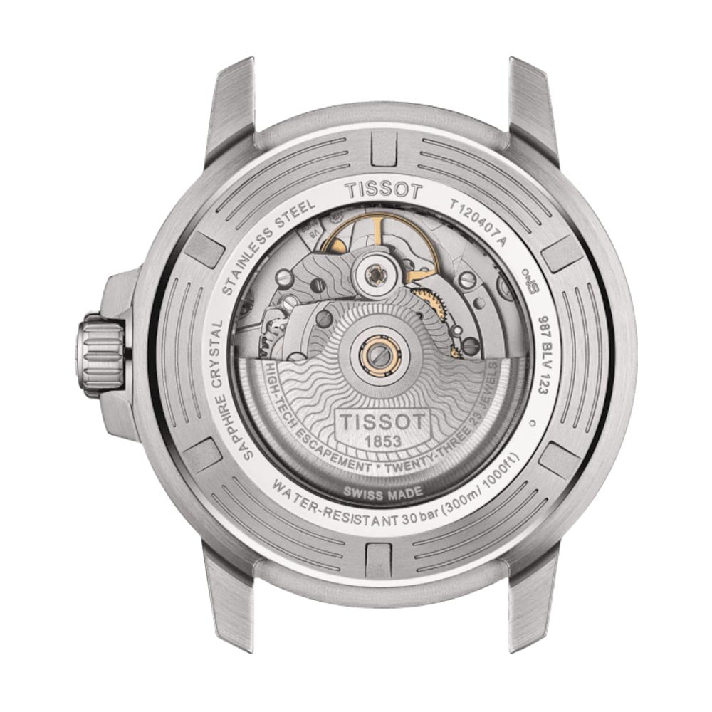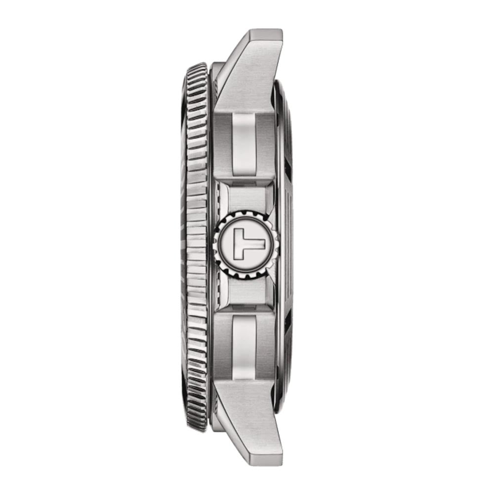 The Tissot Seastar 1000 is the instinctive choice for water sports lovers. Its impressive water-resistance up to a pressure of 30 bar (300 m/1000 ft) is combined with the energy of a Swiss-made automatic movement. And features all the element required in a useful instrument: screw-down crown and transparent case back, unidirectional steel bezel with aluminium ring and highly luminescent material for excellent readability in the dark.