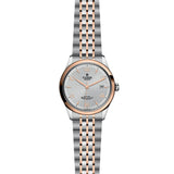 This particular 39mm stainless steel and rose gold timepiece boasts a silver, embossed decoration dial with rose gold hour markers and hands. A date window is visible at 3 o'clock. Framing the dial is a smooth rose gold bezel in a polished finish. At the heart of this watch is a self-winding mechanical movement, Calibre T601, with a power reserve of approximately 38 hours. Finally, it is fitted with a steel and rose gold 7 row link bracelet (satin-brushed external links and polished centre links) with folding clasp and safety catch.