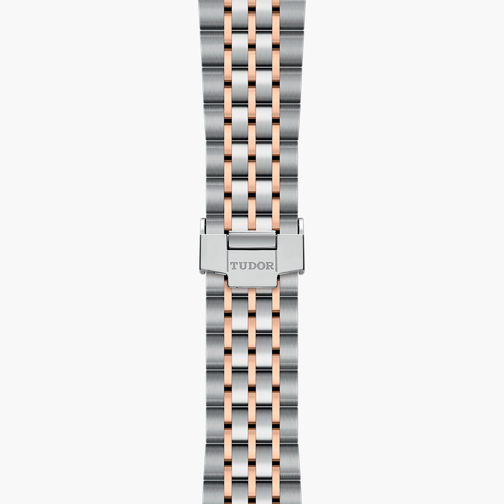 This particular 41mm stainless steel and rose gold timepiece boasts a silver, embossed decoration dial set with 6 diamonds at 1, 3, 5, 7, 9 and 11, with rose gold hour markers and hands. Framing the dial is a smooth rose gold bezel in a polished finish. A date window is visible at 3 o'clock. At the heart of this watch is a self-winding mechanical movement, Calibre T601, with a power reserve of approximately 38 hours. Finally, it is fitted with a steel and rose gold 7 row link bracelet (satin-brushed external links and polished centre links) with folding clasp and safety catch.