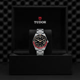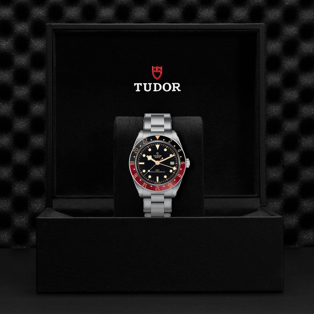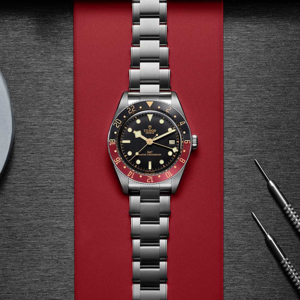 Introduced to the Tudor family at Watches and Wonders 2024, the all-new Master Chronometer certified Tudor Black Bay 58 GMT is an exciting addition to the Black Bay line. The new Black Bay 58 GMT is fitted with TUDOR’s new mid-size GMT Manufacture Calibre paired with warm hues of burgundy, black, and gilt on the bidirectional rotating bezel. This particular reference is fitted with a 3-link “rivet-style” stainless steel bracelet with a Tudor “T-fit” clasp.