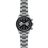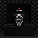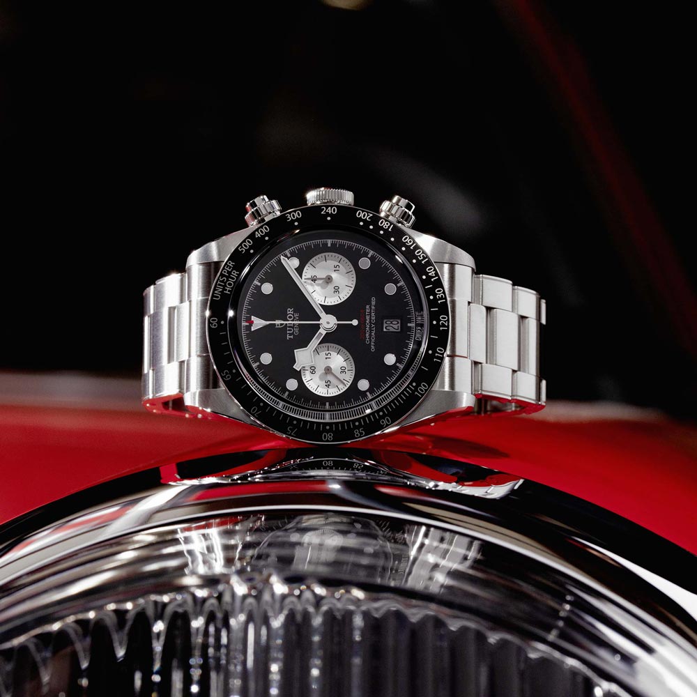 When TUDOR's diving heritage of the Black Bay family meets the racetrack, the TUDOR Black Bay Chrono was born. This 41mm stainless steel timepiece boasts a black dial with silver counters, a date window at 6 o'clock, and white sub-dials. The fixed steel bezel is matt black with tachymetric scale and contrasting silver markings. At the heart of this model is a self-winding mechanical movement with bidirectional rotor system, Manufacture Calibre MT5813 (COSC), offering a power reserve of approximately 70 hours. Finally, it is fitted with a riveted steel bracelet with folding clasp and safety catch.