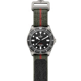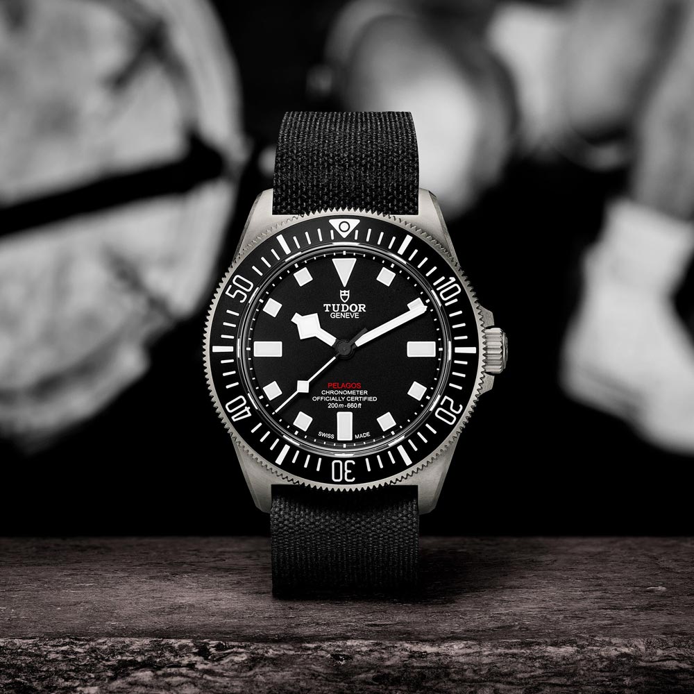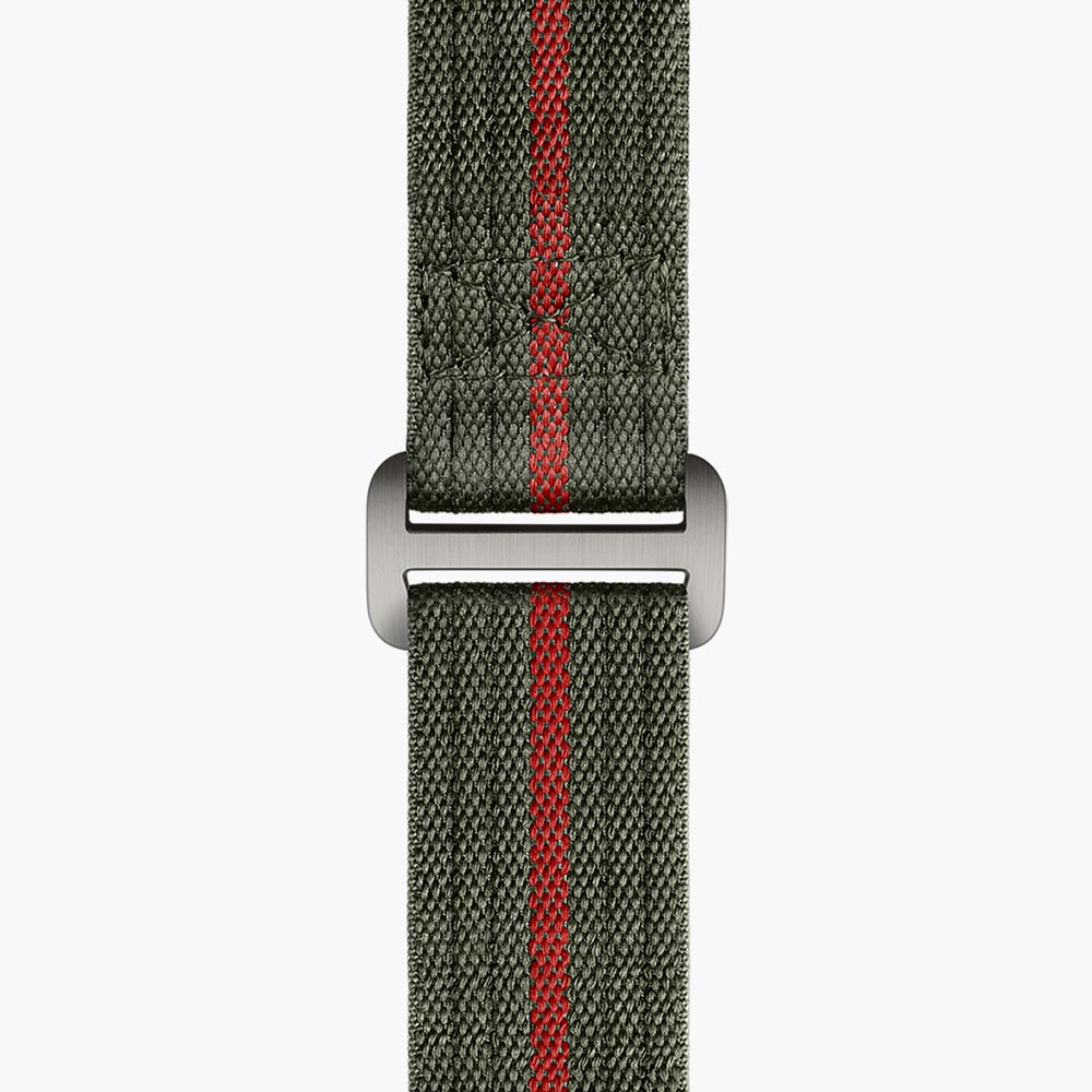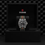 Titanium case, 42mm in diameter, 12.75mm thick, 52mm from lug to lug, featuring a satin-brushed finish and fixed strap bars, with steel case back housing Manufacture Calibre MT5602 (COSC). Self-winding mechanical movement with bi-directional rotor system, with 70-hour power reserve. Titanium crown decorated with embossed TUDOR shield. Unidirectional rotating bezel. Black matte dial. 22mm fabric strap with self-gripping fastening system, forest green with red center thread. Plus black rubber strap with woven motif and titanium pin buckle, included in the box.