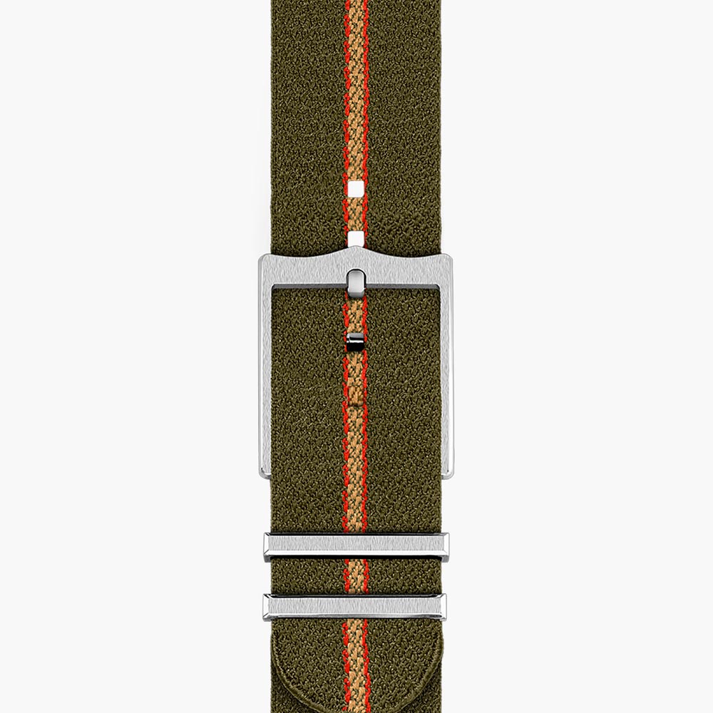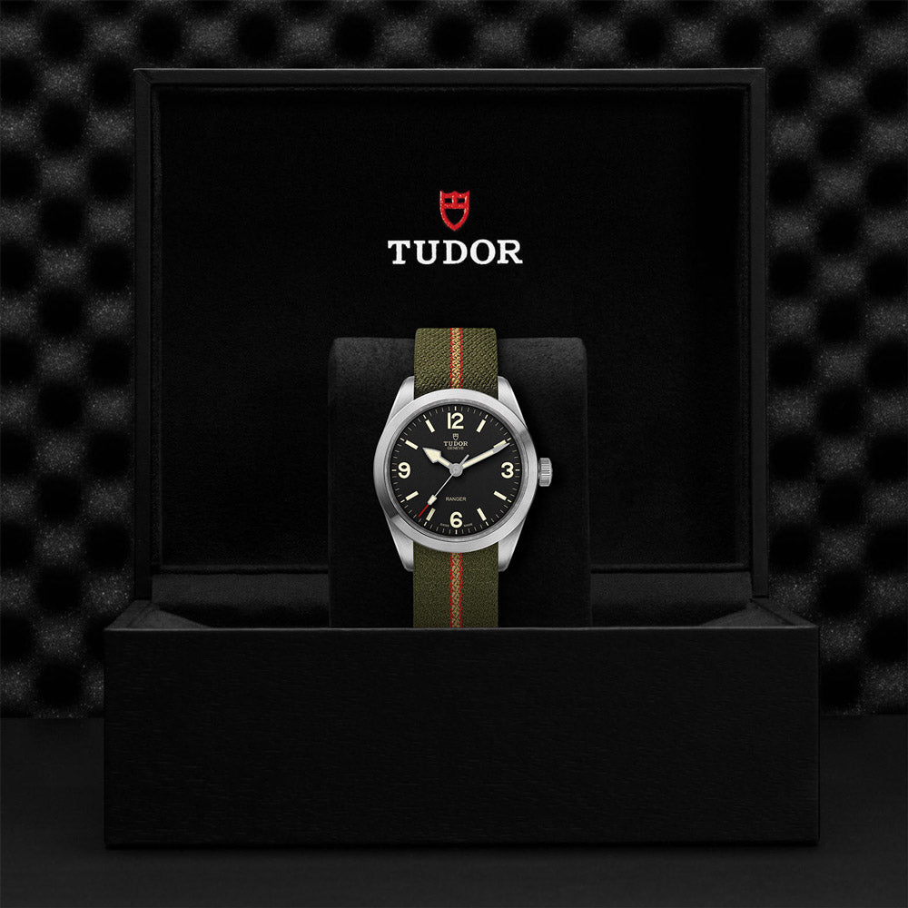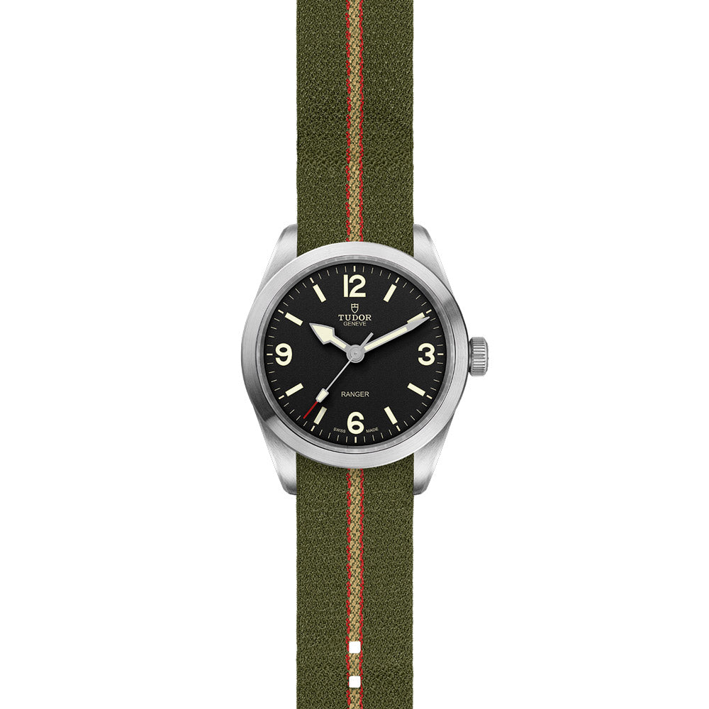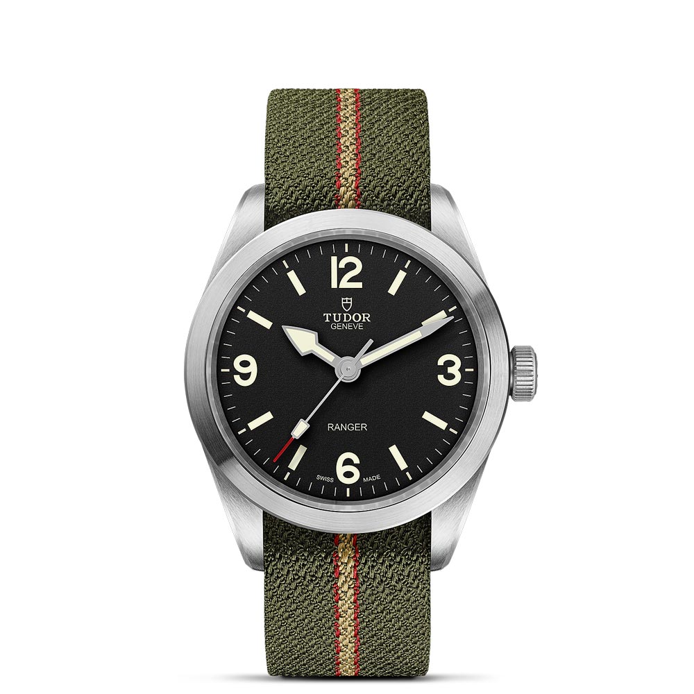 The TUDOR Ranger collection is a suite of tool watches that were launched to commemorate the 70th anniversary of the British North Greenland Expedition. This timepiece offered in stainless steel boasts a 39mm black dial with contrasting Arabic numerals 3, 6, 9 and 12. Housed in this model is a self-winding mechanical movement, MT5402 (COSC), engineered to offer a power reserve of approximately 70 hours. It is fitted with a green fabric strap with red and beige stripes and buckle.