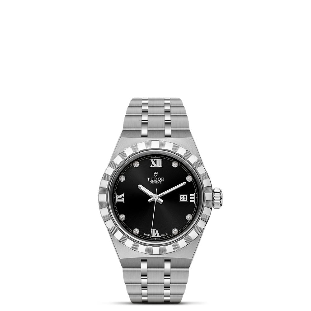 Royal is the name first used by TUDOR in the 1950s to emphasise the superior quality of its watches. With this heritage in mind, the TUDOR Royal collection offers versatile sport-chic watches with an integrated bracelet and a variety of dial options. This particular timepiece boasts a 28mm black sunray dial set with 8 diamonds, and a date window visible at 3 o'clock. At the heart of this timepiece is a mechanical movement, Calibre T201, engineered to offer a power reserve of up to 38 hours. It is fitted with an integrated 5 row steel bracelet with folding clasp and safety catch.