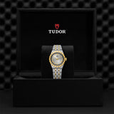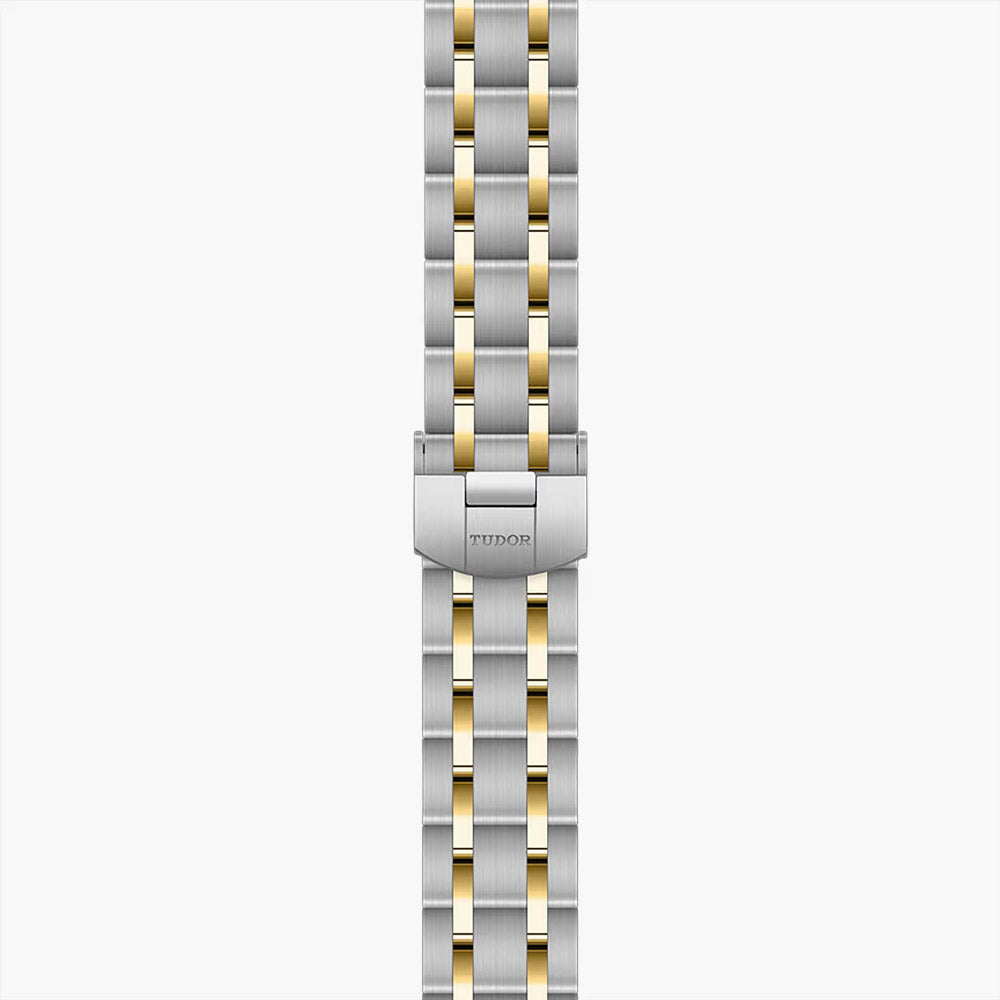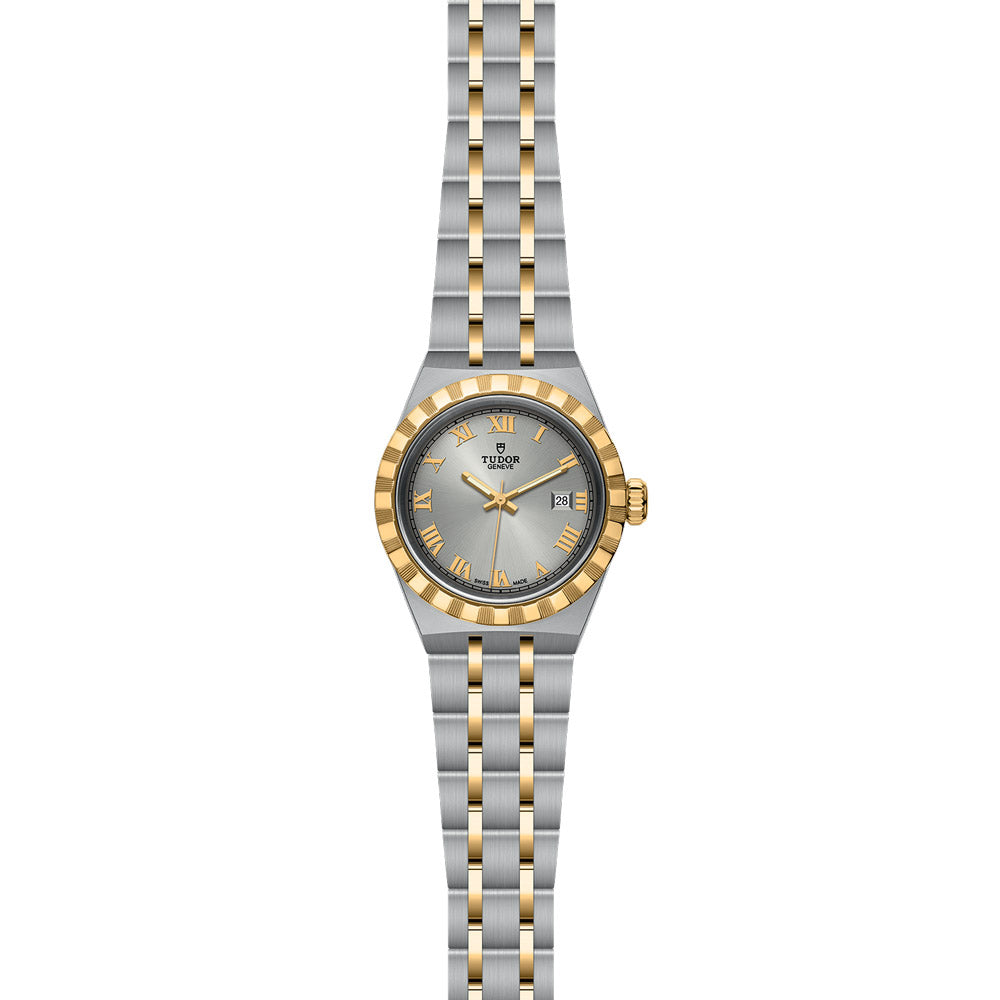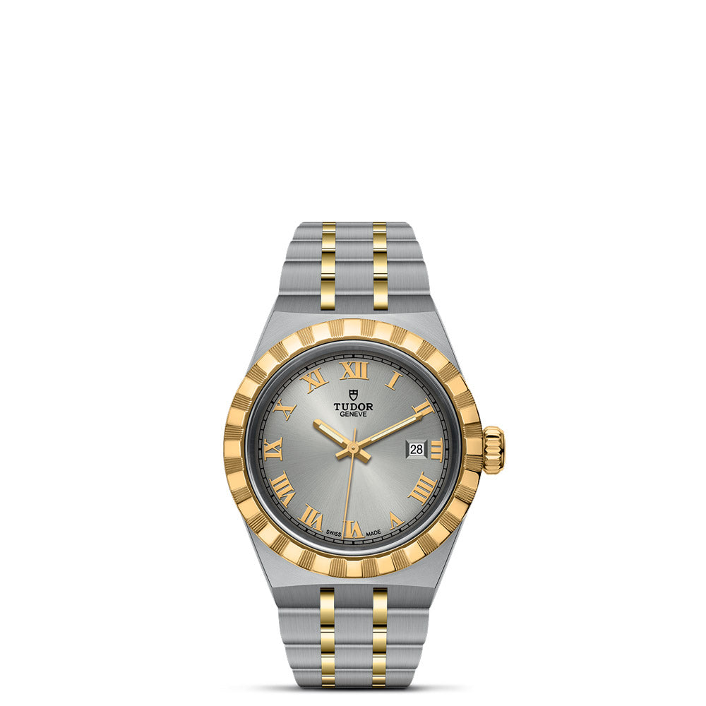 Royal is the name first used by TUDOR in the 1950s to emphasise the superior quality of its watches. With this heritage in mind, the TUDOR Royal collection offers versatile sport-chic watches with an integrated bracelet and a variety of dial options. This particular timepiece boasts a 28mm silver sunray dial, gold toned roman numerals, and a date window visible at 3 o'clock. Framing the dial is a beautiful yellow gold notched bezel. At the heart of this timepiece is a mechanical movement, Calibre T201, engineered to offer a power reserve of up to 38 hours. It is fitted with an integrated 5 row steel and yellow gold bracelet with folding clasp and safety catch.