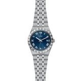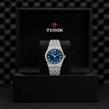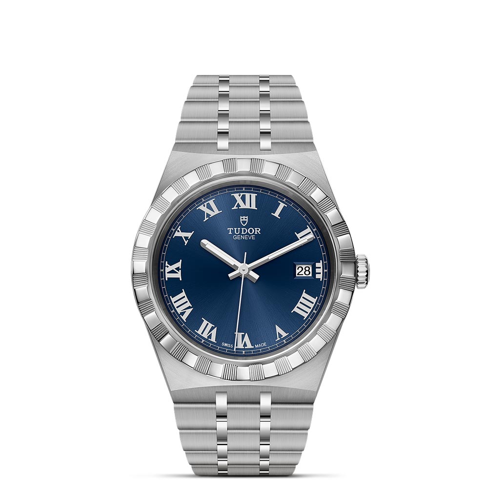 Royal is the name first used by TUDOR in the 1950s to emphasise the superior quality of its watches. With this heritage in mind, the TUDOR Royal collection offers versatile sport-chic watches with an integrated bracelet and a variety of dial options. This particular timepiece boasts a 38mm blue dial with roman numerals, and a date window visible at 3 o'clock. Framing the dial is a beautiful notched bezel, an iconic feature of the Royal line. At the heart of this timepiece is a mechanical movement, Calibre T601, engineered to offer a power reserve of up to 38 hours. It is fitted with an integrated 5 row steel bracelet with folding clasp and safety catch.