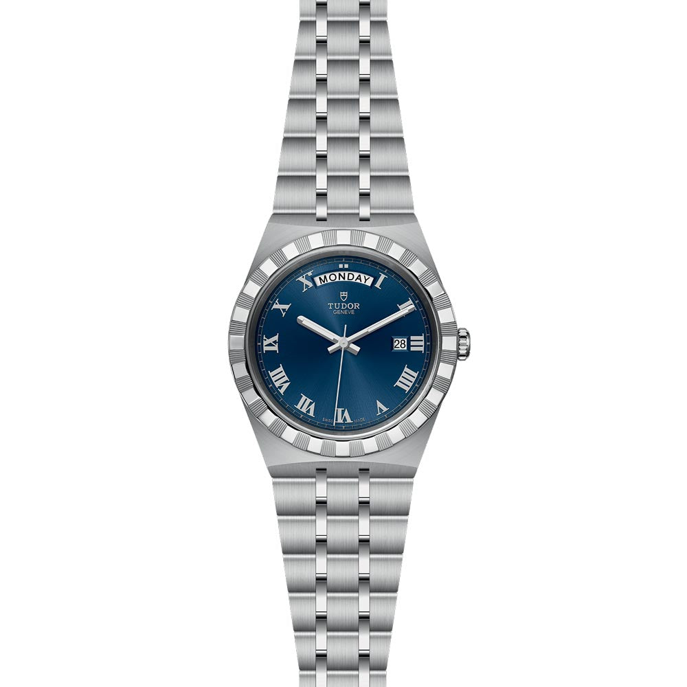 Royal is the name first used by TUDOR in the 1950s to emphasise the superior quality of its watches. With this heritage in mind, the TUDOR Royal collection offers versatile sport-chic watches with an integrated bracelet and a variety of dial options. This particular timepiece boasts a 41mm blue sunray dial set with roman numerals, and day-date function (day at 12 o'clock and date at 3 o'clock). Framing the dial is a beautiful steel notched bezel, an iconic feature of the Royal line. At the heart of this timepiece is a mechanical movement, Calibre T603, engineered to offer a power reserve of up to 38 hours. It is fitted with an integrated 5 row steel bracelet with folding clasp and safety catch.